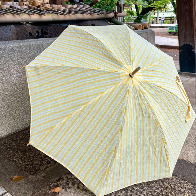 日本橋・竺仙オリジナルの小千谷縮を贅沢に使った、涼やかな日傘のご紹介です。