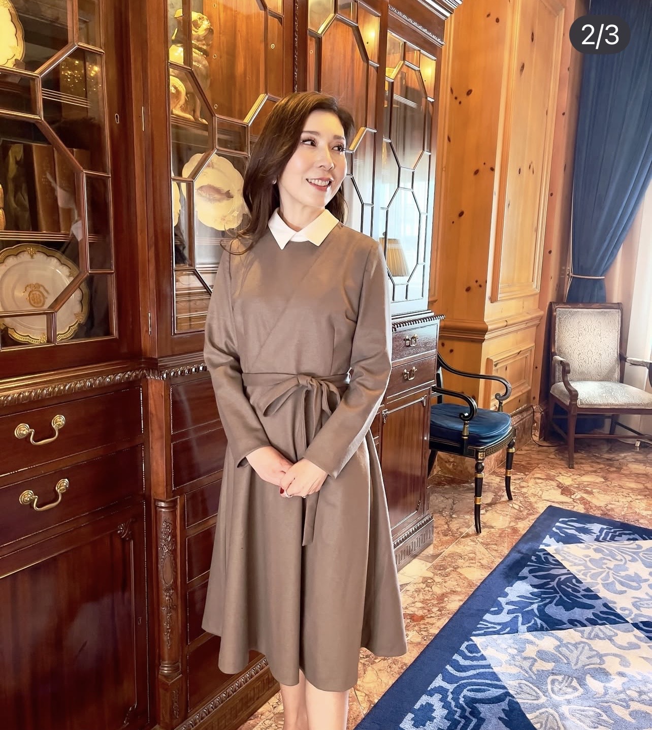 取り外し可能のシルク襟を添えたウールニットワンピースは、