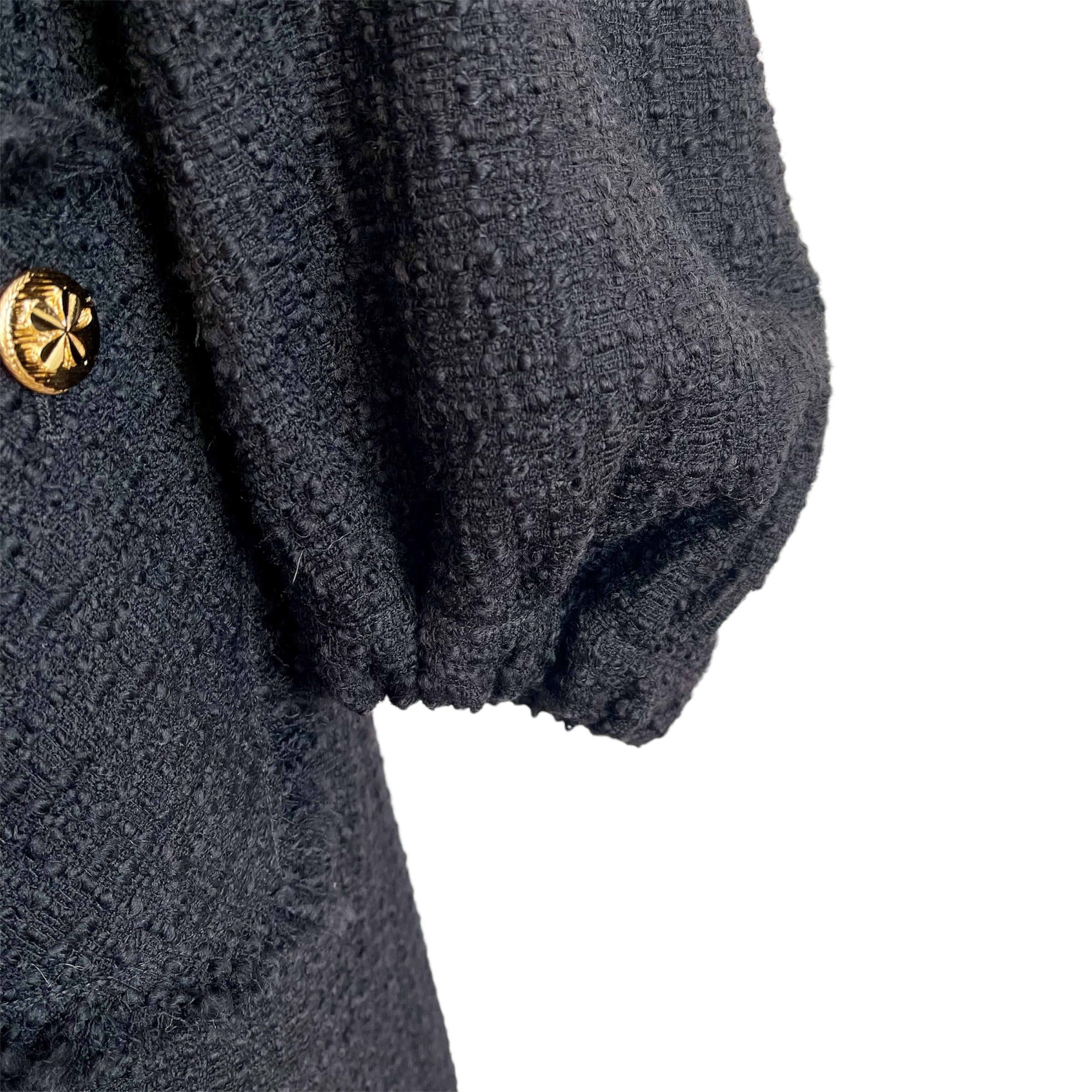 重くなりがちな黒も、イタリア製の上質なツイードならではの織りの立体感があるため、